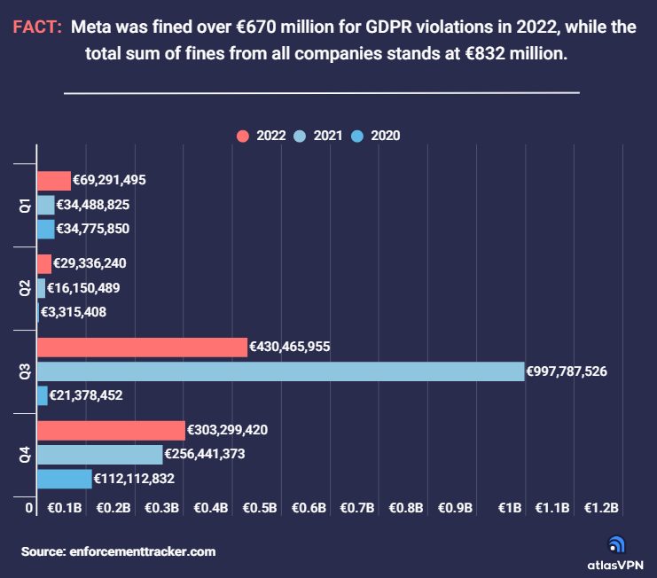 Uit de laatste door Atlas VPN geanalyseerde gegevens blijkt dat bedrijven in 2022 in totaal €832 miljoen aan AVG-boetes hebben gekregen, wat 36% lager is dan de €1,3 miljard die in 2021 moest worden betaald.